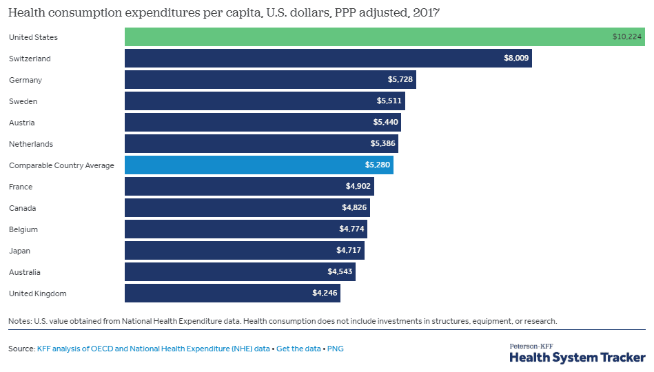 It’s not hard to understand why. Medical debt is a very real problem for over 137 million Americans and the reason for 66.5% of personal bankruptcy filing. Overall Americans spent $3.3 trillion on healthcare or about $10,224 per person in 2017. The two largest spenders were the federal government and private individuals. The next closest country is Switzerland, spending approximately 2K less per person per year.